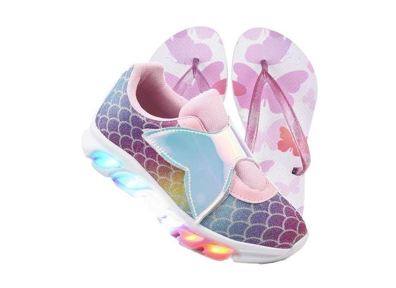 O menor preço encontrado no Brasil para Tenis Feminino De Led Calce Facil Refletivo Infantil Sereia + Chinelo atualmente é R$ 89,99.
