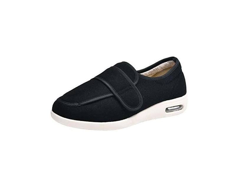Tênis feminino elegante para diabéticos, extralargo, respirável, leve, para caminhada, edema, alça ajustável, fácil de colocar e tirar para apoiar pés inchados, fascite plantar, Nylon com pilha preta,