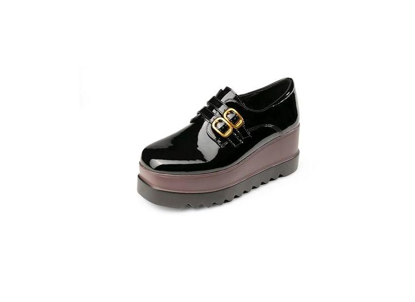 Tênis feminino plataforma Oxford clássico couro envernizado PU bico quadrado com cadarço casual, B - preto, 38