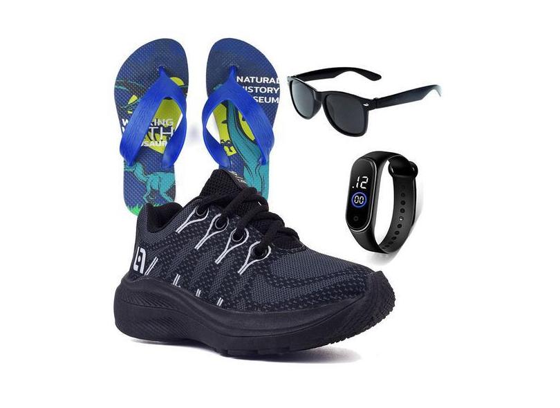 Tenis Infantil De Amarrar Meninos Leve Desenhos Light + Chinelo Oculos