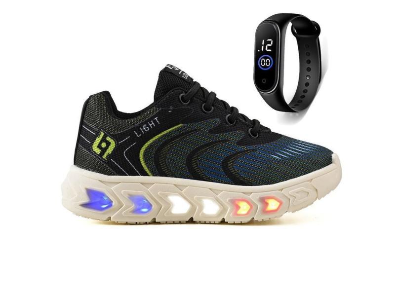 Tenis Infantil De Led Masculino Homem Escolar Casual Calce Facil Basico + Relogio-Masculino
