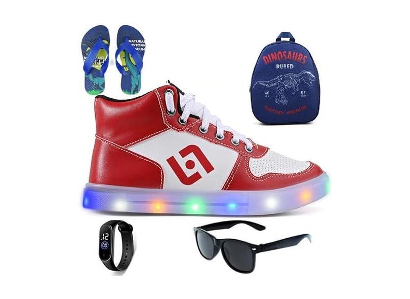 Tenis Infantil De Led Meninos Botinha Cano Alto Escolar Casual Basico + Mochila Chinelo Oculos Relogio