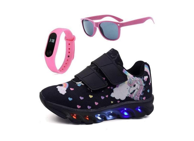 Tenis Infantil De Led Unicornio Calce Facil Meninas Light + Oculos Rel