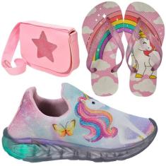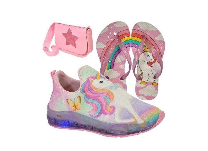 Tênis Infantil Feminino Com Led Unicórnio Slip On Menina + Chinelo + B