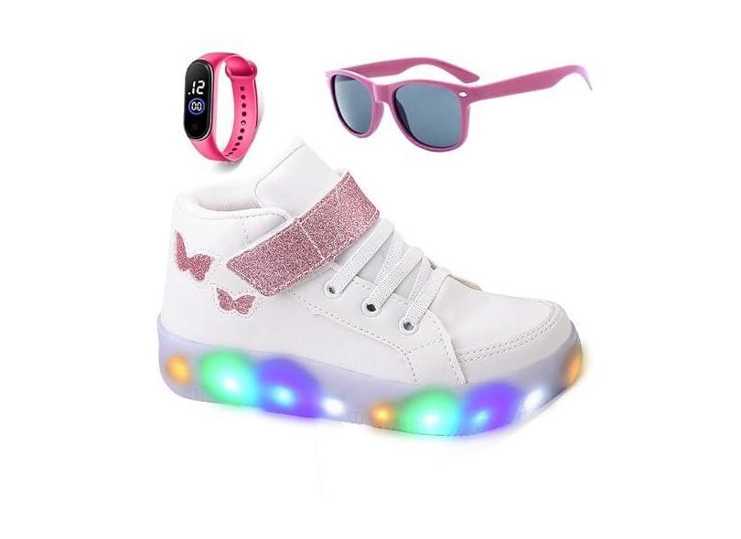 Tenis Infantil Feminino De Led Botinha Borboleta Glitter Meninas + Óculos + Relogio