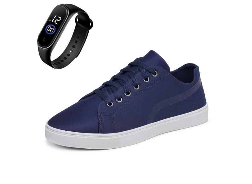 Tênis Masculino Casual Em Lona Solado Reto Cadarço + Relógio-Masculino