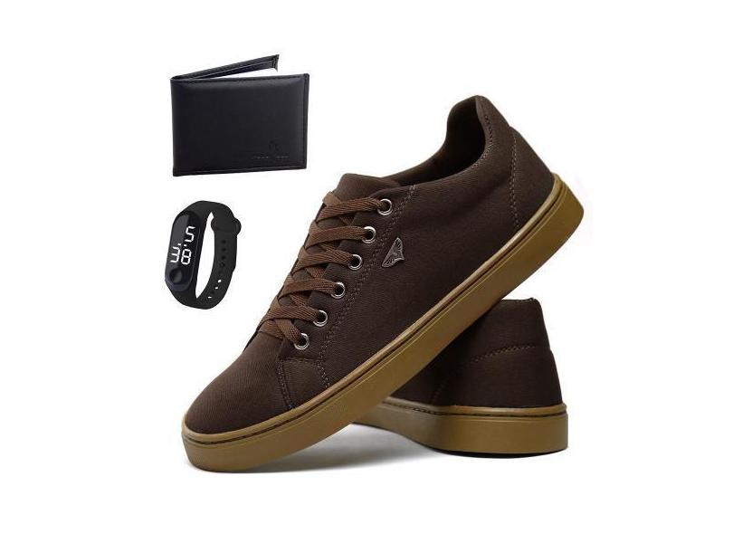O menor preço encontrado no Brasil para Tênis Masculino Casual Sapatenis Skate Kit Com Carteira E Relogio ! - atualmente é R$ 55,71.