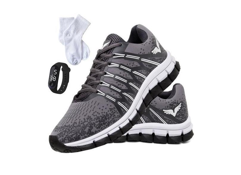 O menor preço encontrado no Brasil para Tenis Masculino Kit Meias + Relogio Sapato Esportivo Veloz - GP, Cinza atualmente é R$ 130,11.
