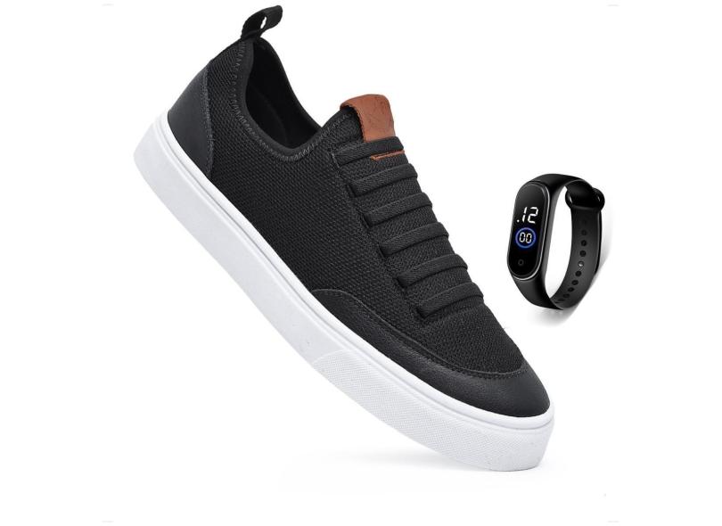 Tenis Sapatenis Cano Baixo Casual Calce Facil Cadarço Elástico Preto Confortável Leve + Relógio-Masculino