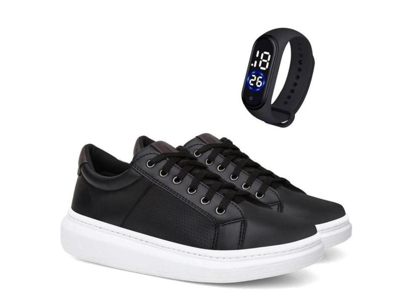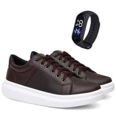 Tenis Sapatenis Casual Urbano Masculino em Couro Confortavel + Relogio Digital-Masculino