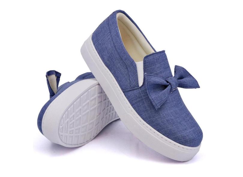 Tenis Slip On Feminino de Tecido Jeans com Laço e Sola Alta Detalhe Listra-Feminino