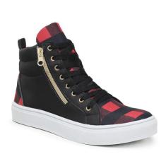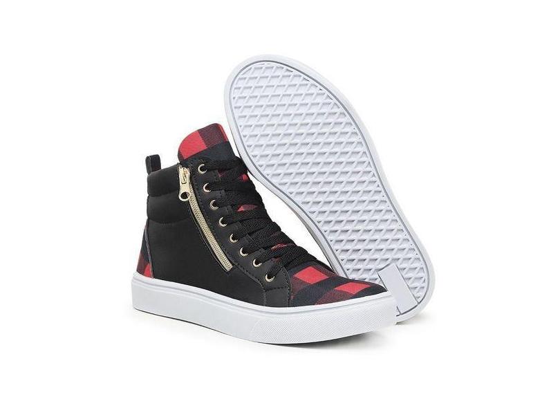 Tênis Sneaker Cano Alto Feminino Cadarço Zíper Estilo Macio Preto Xadr