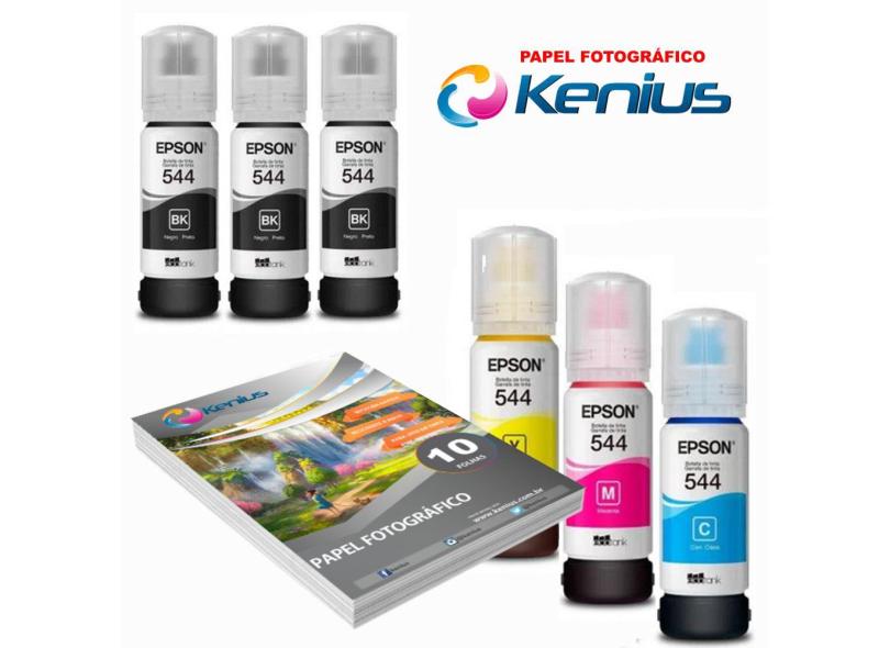 Kit Refil Epson 6 T544 L3150 + Papel Foto 10X15 10 Folhas Kenius