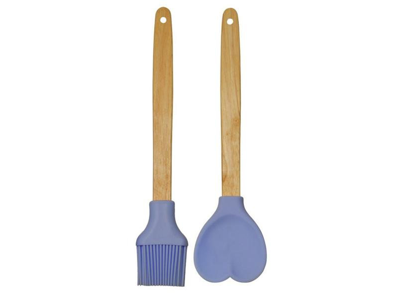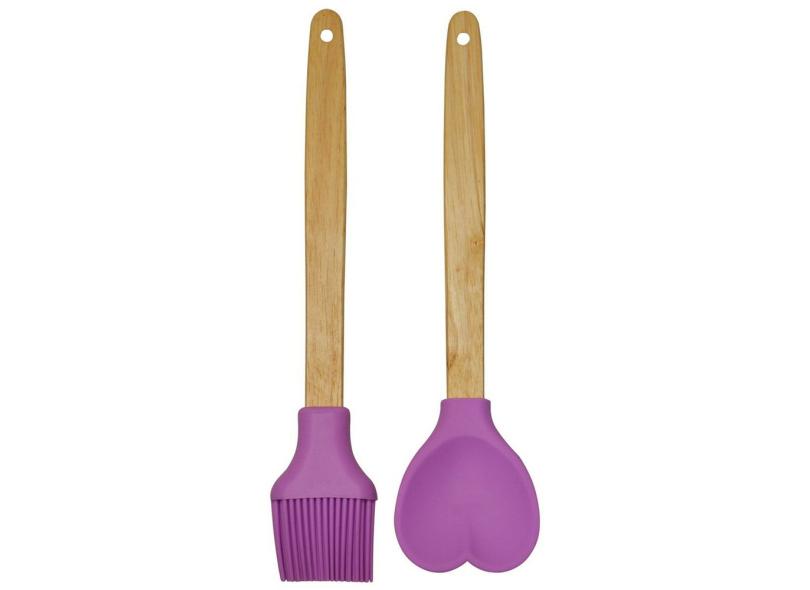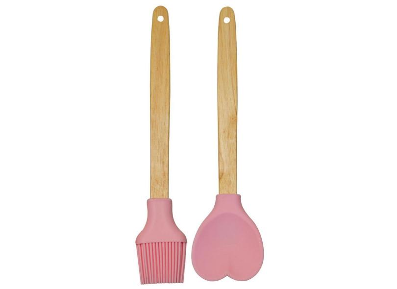 Colher De Silicone Coração E Pincel De Untar De Cabo Madeira