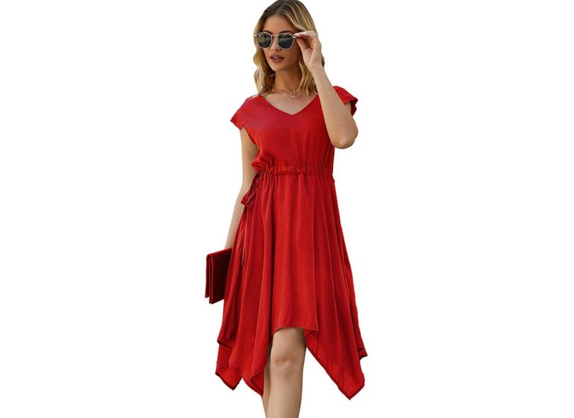 Cap Moda feminina Irregular Vestido V Neck mangas com cordão cintura alta assimétrico Hem Holiday Beach Boho Casual Vestido L