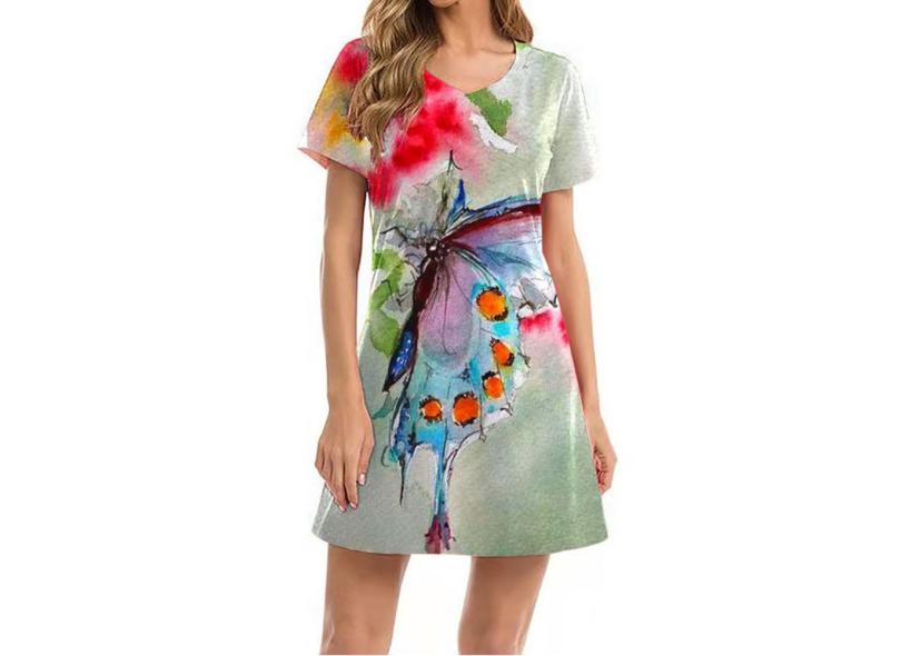 Hobby Moda feminina estampagem de plantas femininas com decote redondo manga curta vestido casual confortável