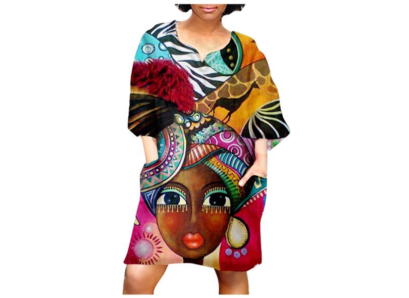 Mini vestido casual feminino da moda africana com estampa vintage de manga média com decote em V 4XL