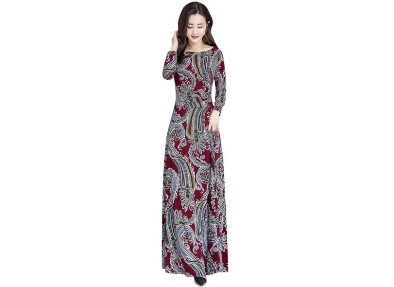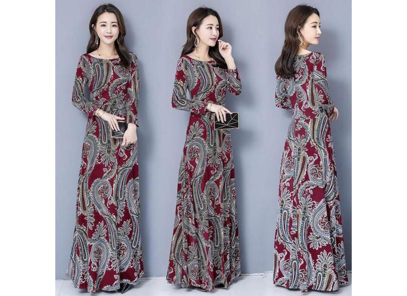 Moda feminina casual outono inverno estampado O-pescoço vestido de manga comprida vestido longo