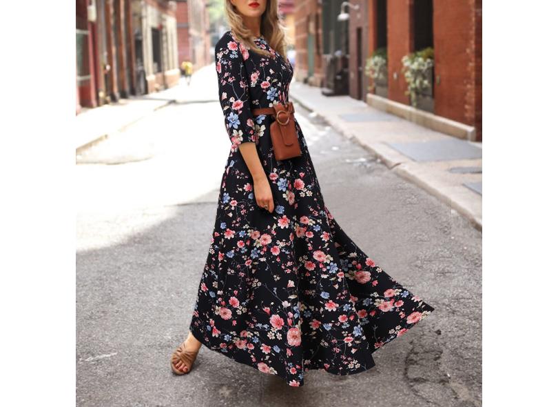 Moda feminina vestido longo manga 3/4 estampa floral vestidos festa casual solto swing vestido maxi plus size L