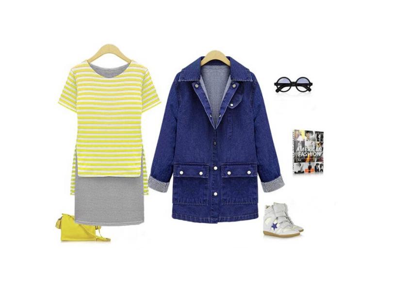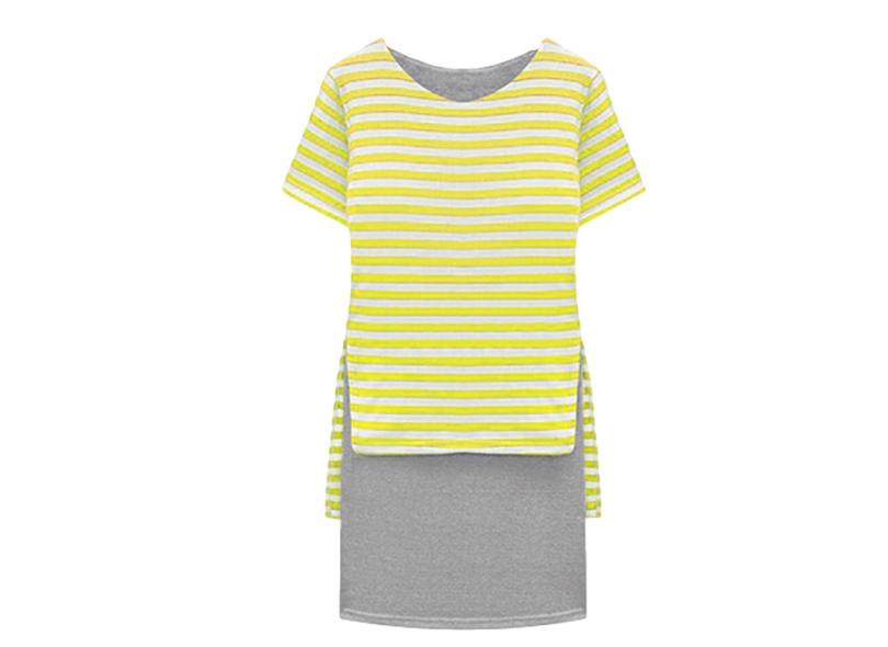 New Casual Vestido Mulheres Stripe Overlay O-Neck mangas curtas Yellow Xl