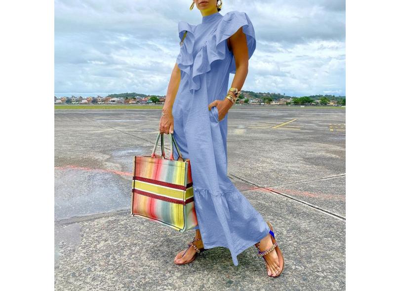 Vestido de verão para festa de praia feminino babado sem mangas vestido longo com decote em tartaruga vestido solto em linha A S-5XL 3XL