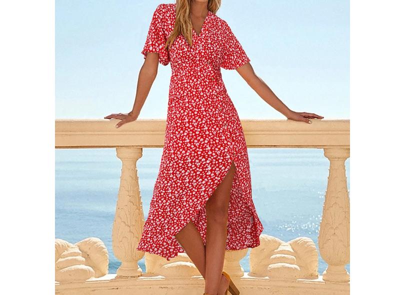 Vestido feminino com estampa floral de manga curta com decote em V longo vestido irregular com bainha solta para festa de férias em tamanho maior xl