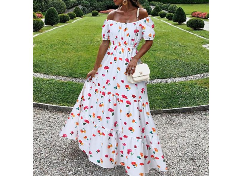Vestido feminino de verão floral estampado maxi sem ombro Bohemian férias festa casual plissado vestido longo com babados tamanho plus L