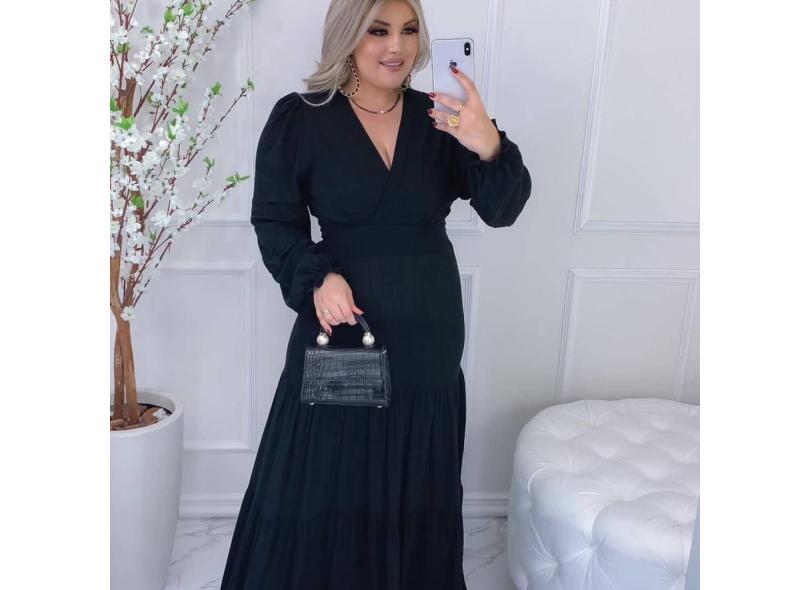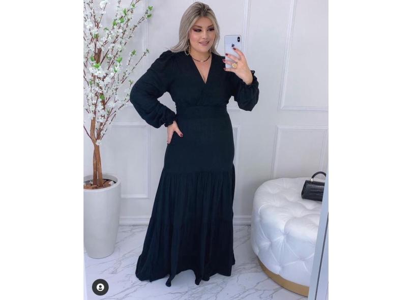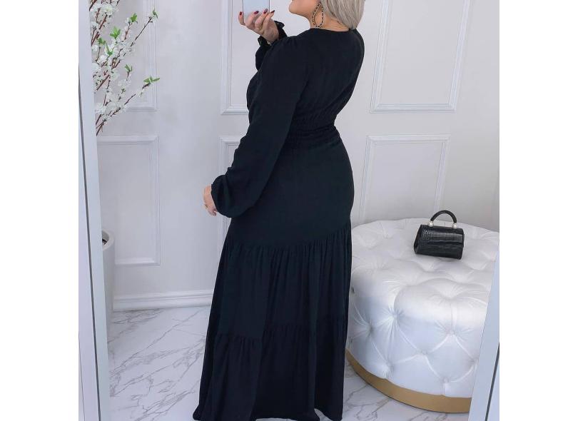 Vestido Longo Tecido Viscolinho Manga Longa Babado Com Lastex